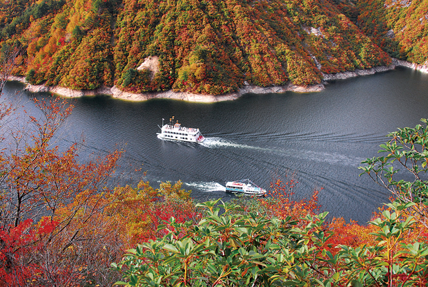 全国有数の貯水量を誇るダム湖で、江戸時代に銀鉱があったことから「銀山湖」とも呼ばれており、11月上旬まで湖上遊覧が楽しめます。