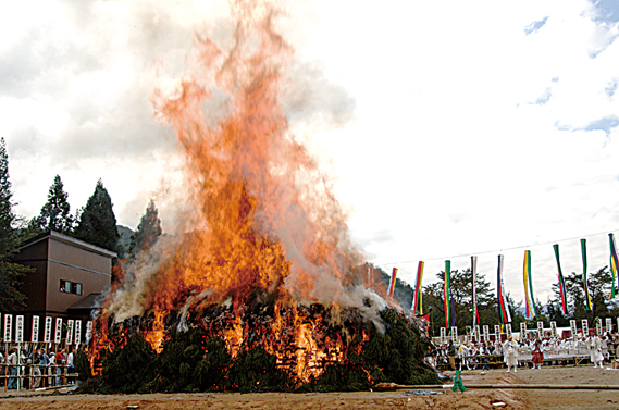 全国有数の規模を誇る八海山尊神社の大火渡り祭は、毎年10月20日に行われ、各地から訪れる多くの信者でにぎわいます。祭壇の前に積み上げた護摩木が燃え尽き、真赤な炭になったところを、家内安全・無病息災を念じて素足で渡ります。神事には信者だけでなく、一般の方も参加できます。