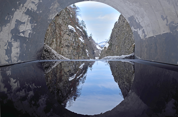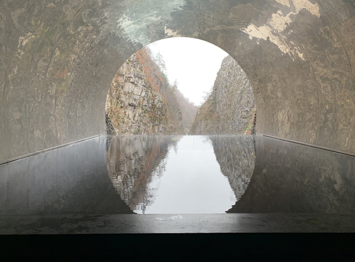 全長750mの歩道トンネル「清津峡渓谷トンネル」の終点パノラマステーションでは、雄大で壮厳な峡谷美を安全に鑑賞することができ、水鏡に映り込んだ大峡谷が広がる幻想空間をお楽しみいただけます。