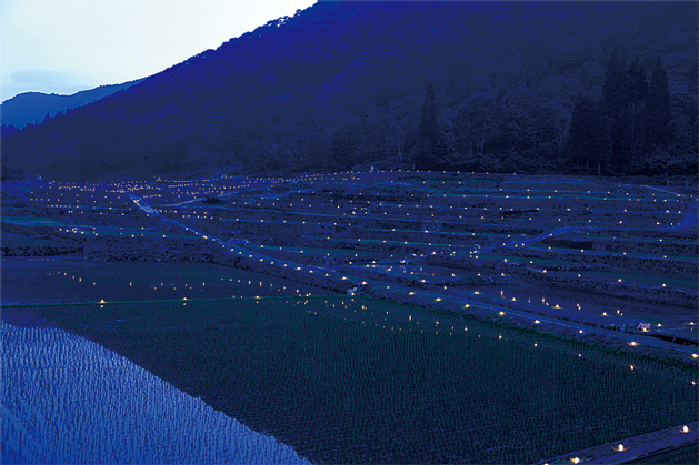 結東の石垣田で6月に行われ、石垣田の歴史や素晴らしさを沢山の人に知ってもらい、多くの人の力を借りて石垣田を存続させたいという願いから、結東集落、石垣田保存会、石垣田を愛する有志が協働で田植え後の石垣田に数千個ものキャンドルを設置し、満天の星の下で幻想的な夜を過ごすイベントです。