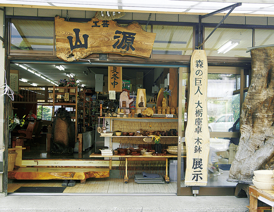 年輪が美しい輪切りテーブルはこの工房の初代が考案したもの。